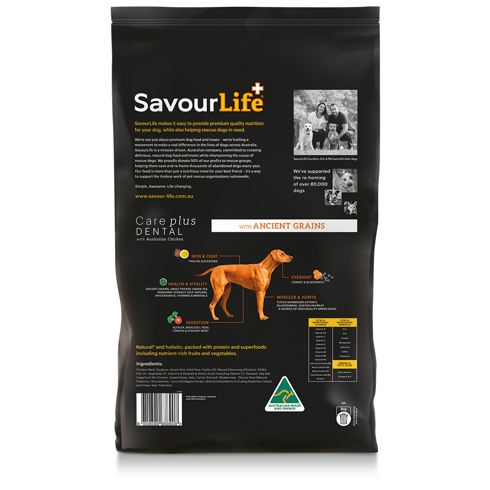 SavourLife’s Ancient Grain Care Plus Dental with Australian Chicken is the latest instalment into our functional-health Care Plus range. Crafted for adult dogs of all breeds and sizes, Ancient Grain Dental is designed to provide complete dental support of teeth and gums, whilst delivering the same high-quality nutrition which Ancient Grain is known for.