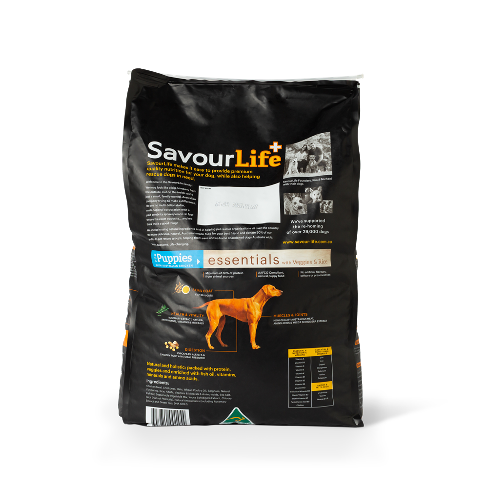 SavourLife Essentials Chicken with Veggies & Rice for Puppies is an all-natural, Australian-made and owned food, made with premium Australian Chicken, the perfect meat for puppy’s sensitive tummies, making it the perfect food for your puppy!