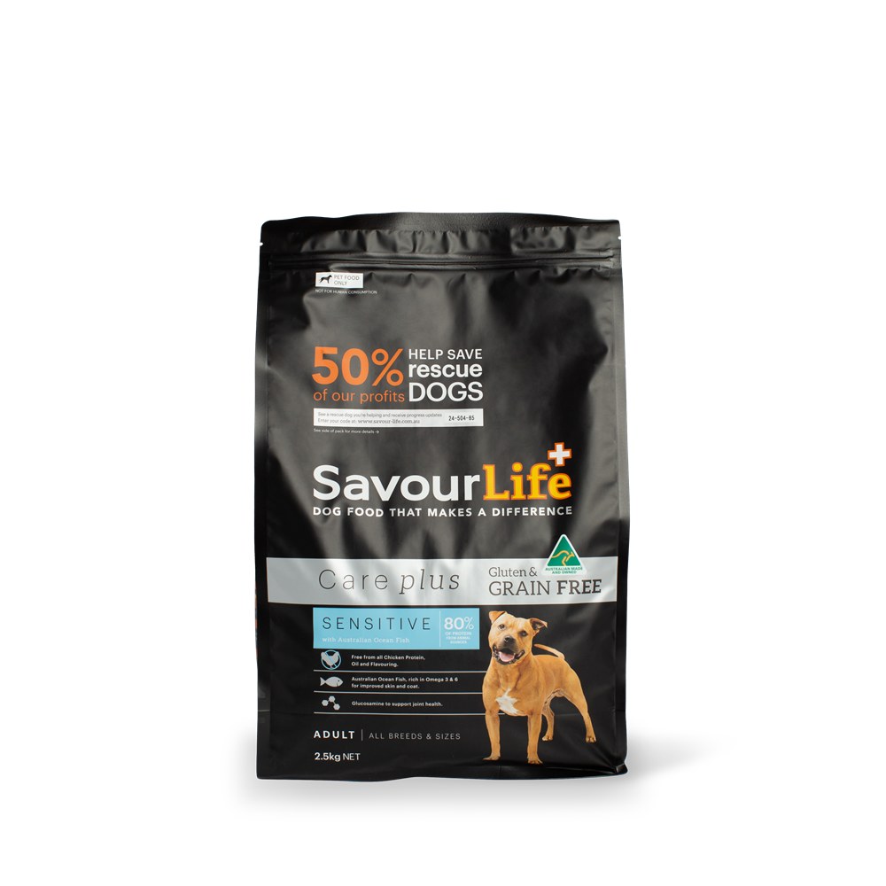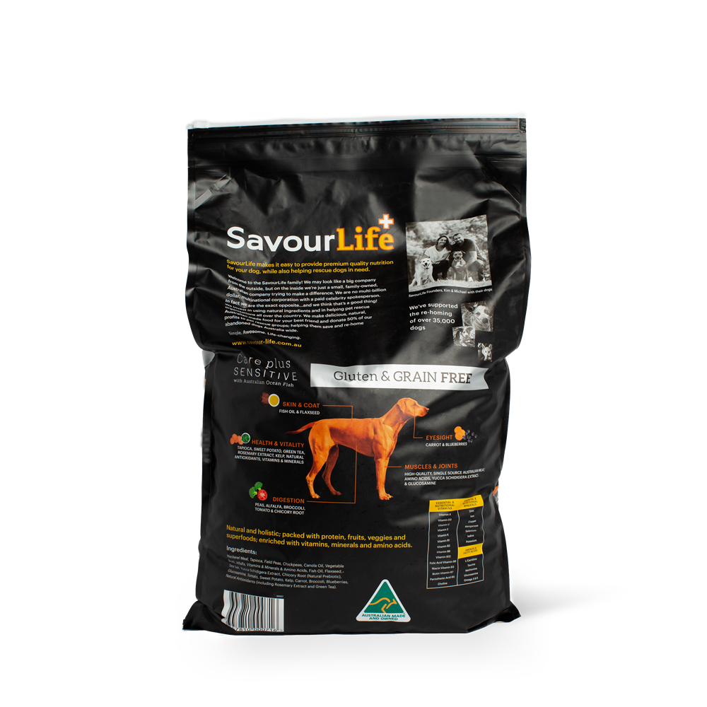 SavourLife’s Grain Free Sensitive with Australian Ocean Fish is a special formula for dogs with a chicken intolerance. Our Australian fish recipe provides sensitive dogs with a complete, natural food free of any chicken, so that they can also enjoy our premium quality dog food!