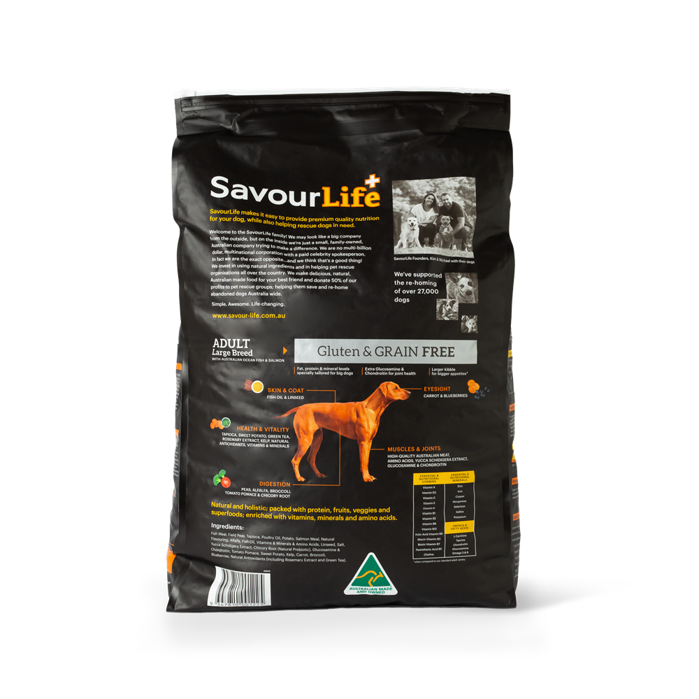 SavourLife’s Grain-Free Large Breed Adult with Australian Salmon and Fish is an all-natural, holistic, Australian-made, gluten-free dog food with natural superfood inclusions like chicory, kelp and blueberries. It is bursting with single-source Australian meat plus vitamins, minerals, natural prebiotics and amino acids. It contains no artificial flavours, colours or preservatives. It has specific minerals for joint health, plus special fat and calories levels designed for big dog needs, plus a large kibble size!