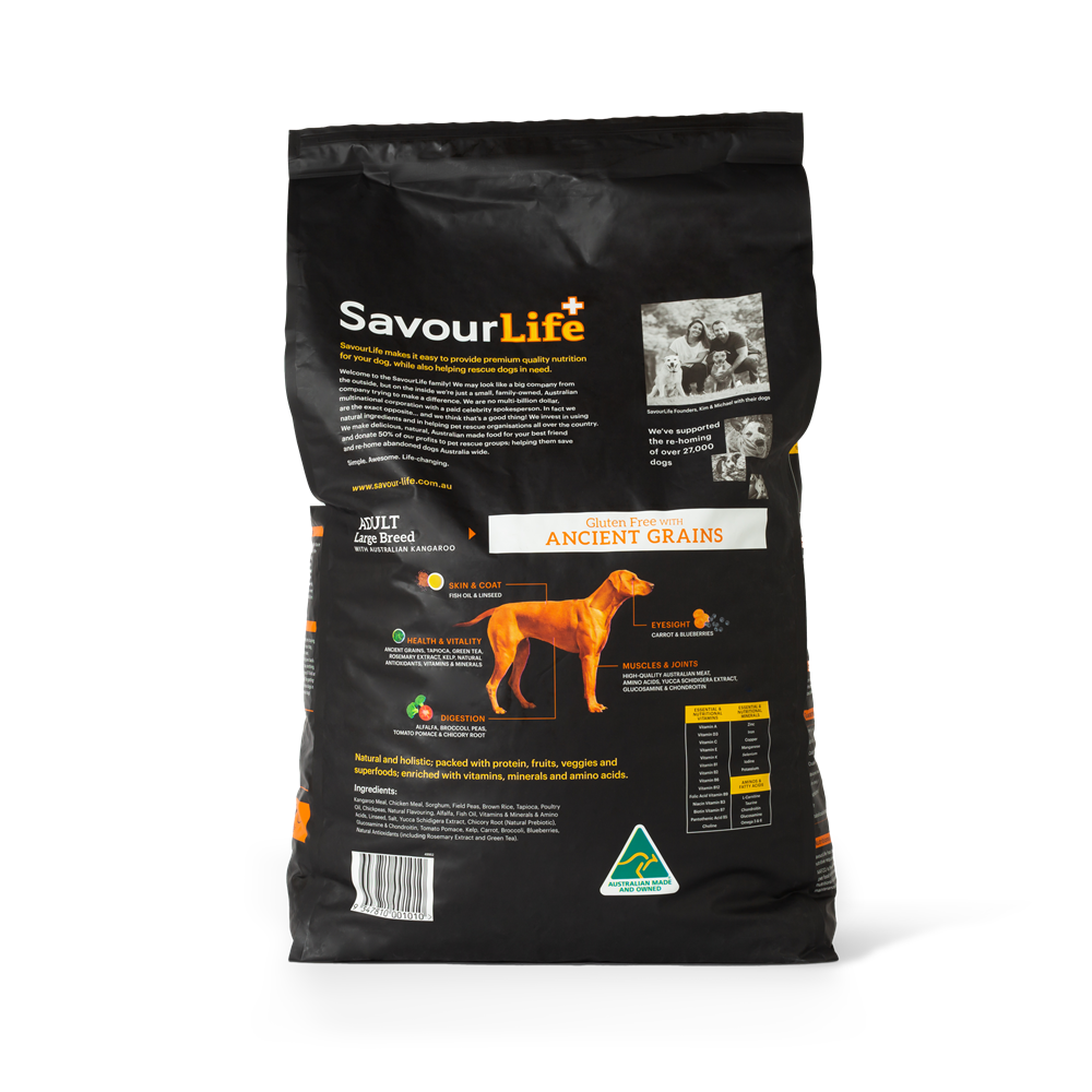 SavourLife’s Ancient Grains Large Breed with Kangaroo food is an all-natural, holistic, Australian-made, gluten-free food with natural superfood inclusions like chicory, kelp and blueberries. It is bursting with Australian meat plus vitamins, minerals, natural prebiotics and amino acids. It contains no artificial flavours, colours or preservatives. Kangaroo is a great lean protein source, and this variety is the perfect choice for dogs who are watching their weight as it has less calories and less fat than our other adult varieties. It has specific minerals for joint health, plus special fat and calories levels designed for big dog needs, plus a large kibble size!