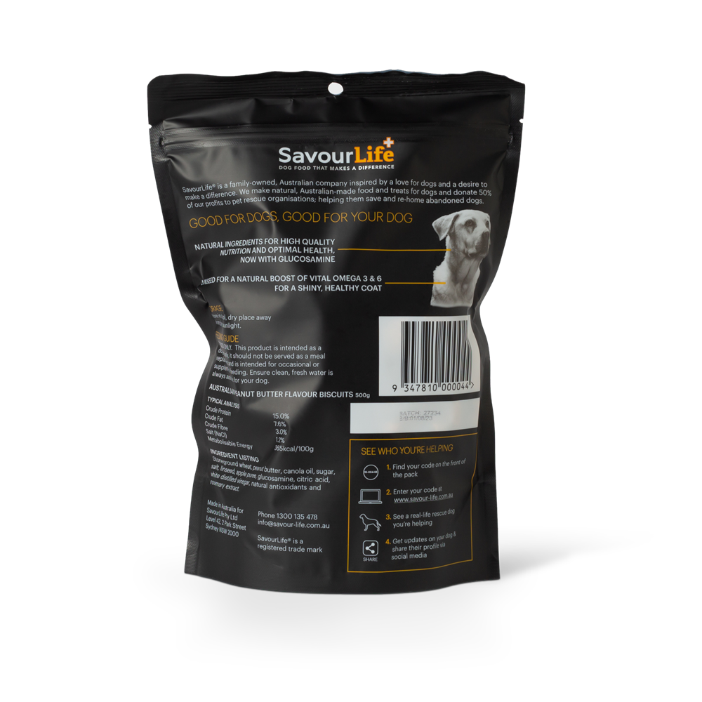 SavourLife's all-natural, oven-baked Australian Peanut Butter Flavour Biscuits contain no artificial flavours, colours or preservatives. Our protein-packed biscuits are made from plate based only Australian ingredients including real Australian peanut butter, vegetable oil and whole linseed. We use only the best natural ingredients for optimal health and nutrition, then we bake them to perfection, giving them a crunchy texture, which is great for promoting healthy teeth and gums. The addition of extra linseed gives a natural boost of vital Omega 3 & 6 acids. Now with glucosamine. The perfect choice for a healthy and delicious treat for your dog.