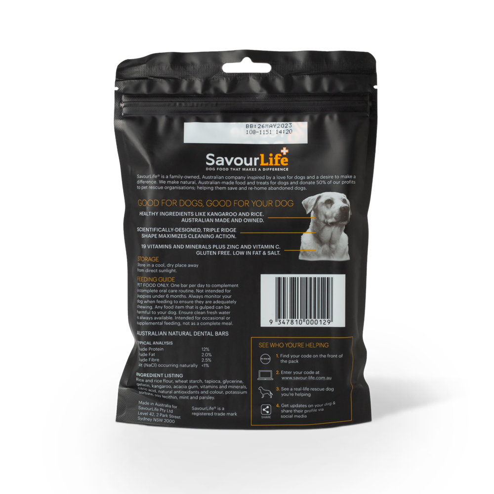 SavourLife’s Australian Natural Dental Bars are scientifically designed to be the perfect addition to your dog’s dental health routine. SavourLife’s unique, triple-ridge design delivers double the cleaning grooves and helps clean teeth and gums, reduce plaque and freshen breath, by gently cleaning teeth and massaging gums. Made in Australia, with a focus on natural ingredients including real Australian Kangaroo, SavourLife’s Natural Dental Bars are gluten free and contain no artificial flavours or colours. They are enriched with 19 vitamins and mineral plus Vitamin C and Zinc; which together may help reduce plaque and tartar formation, support healthy gum tissue and control bad breath. As added benefits they also contain mint and parsley, known breath fresheners and are also low in fat and salt. With a taste that dogs love, they are designed for daily consumption and this size is perfect for medium to large size dogs over approx. 22.5kg. They are a perfect complement to a complete oral care routine to give your dog the best dental hygiene and the freshest breath!