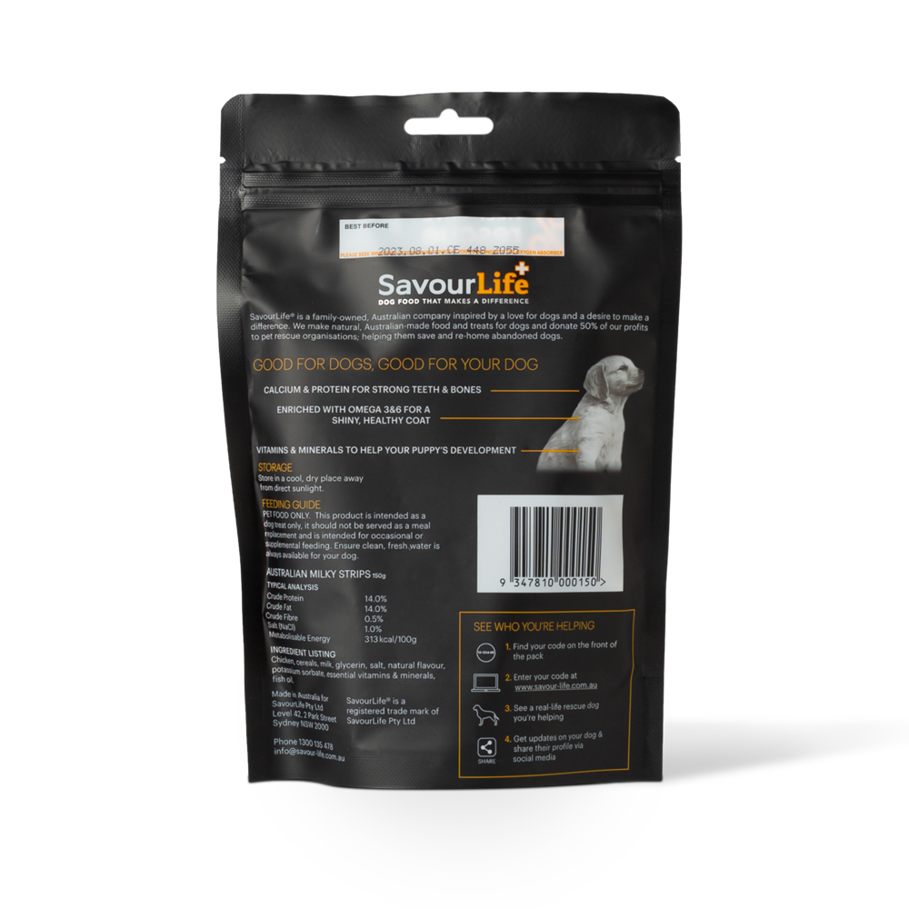 SavourLife's delicious Australian Milky Strips are made from real Australian milk and chicken! They are enriched with essential vitamins and minerals to help your puppy's development and the addition of fish oil gives a natural boost of vital Omega 3 & 6 for a shiny and healthy coat. We use a special drying process to capture the natural goodness and their naturally chewy texture is great for promoting healthy teeth and gums. They are packed with protein and calcium for strong teeth and bones. A delicious, healthy treat for puppies and dogs of all shapes and sizes. There are no artificial flavours and absolutely no colourings!