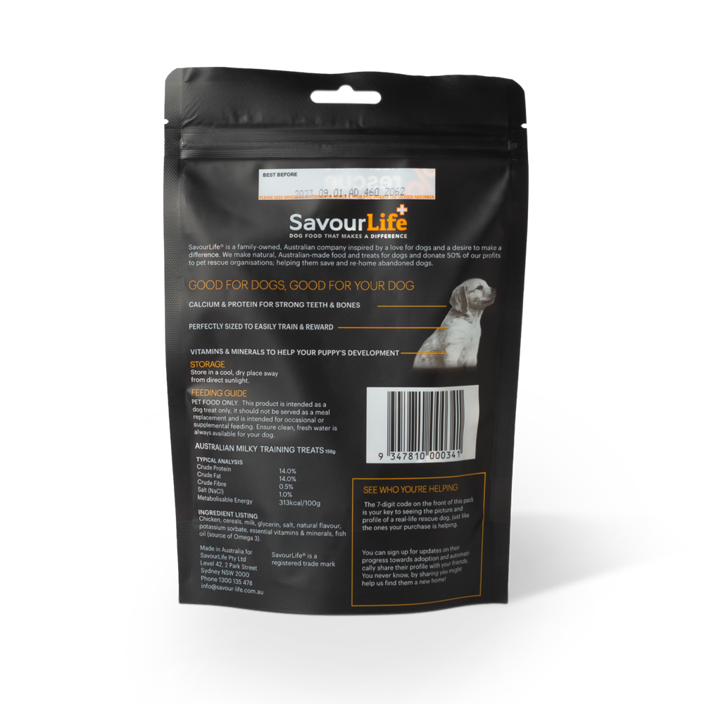 SavourLife’s new Australian Training Treat Range are delicious, bite-size, meaty chunks; perfect for training and rewarding (and great as toy stuffers too!). Based on our popular Strips Range recipes we make them right here in Australia, from ingredients including real Australian meat, and they contain no artificial colour or flavours. Great to have on hand when you are walking, playing or having fun! We have done the hard work for you! These tasty morsels are perfectly sized in little cubes to easily train and reward. No more cutting up meat or trying to break treats with your hands! Our Training Treats are high-value; that’s training speak for ‘your dog will do anything for the taste!’ Not only do dogs love them, they are healthy too! They are enriched with vitamins and minerals, plus we have added fish oil, packed with Omega 3&6, for a shiny and healthy coat. As an added bonus they are low in fat and salt.